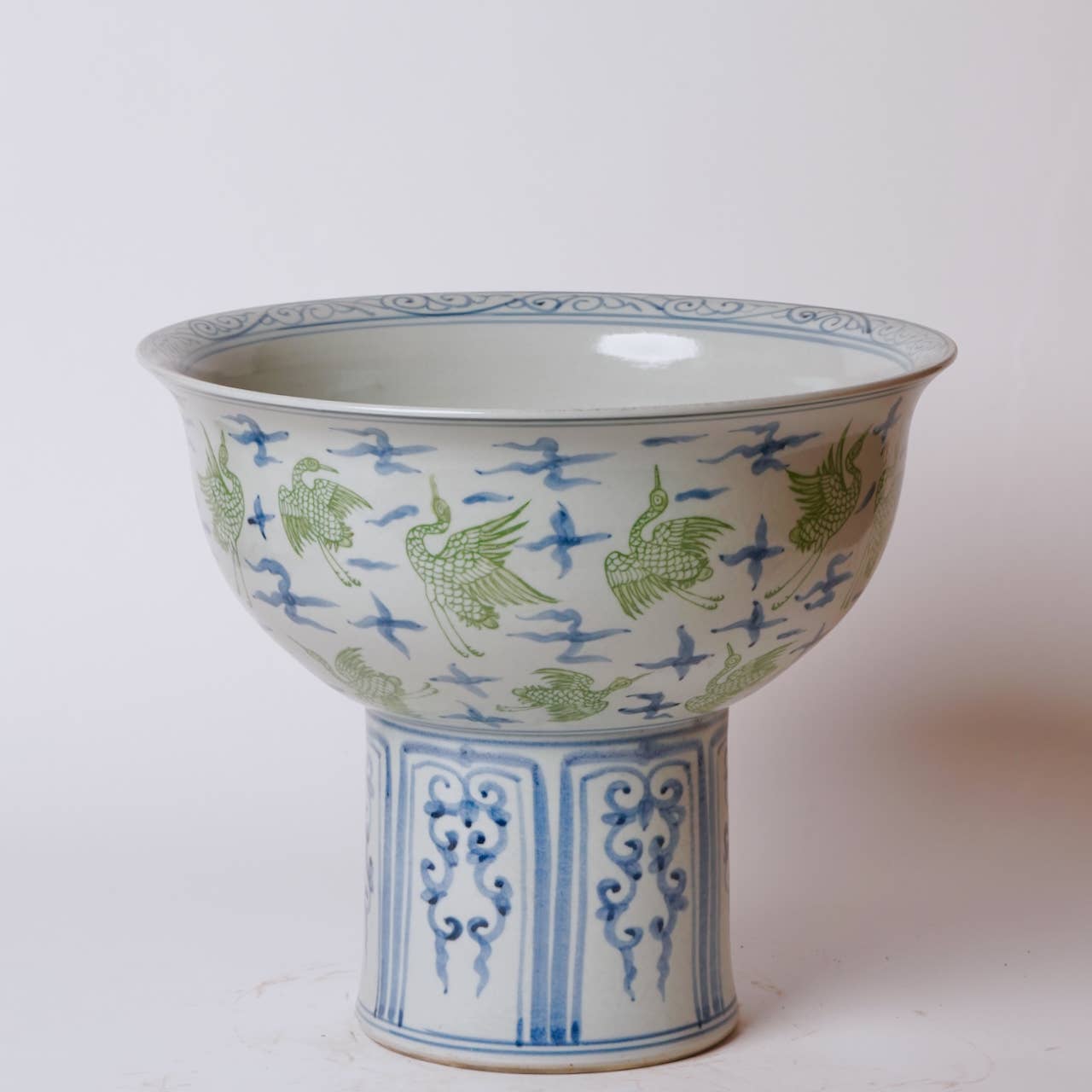 Green and Blue Porcelain Crane and Clouds Large Footed Bowl