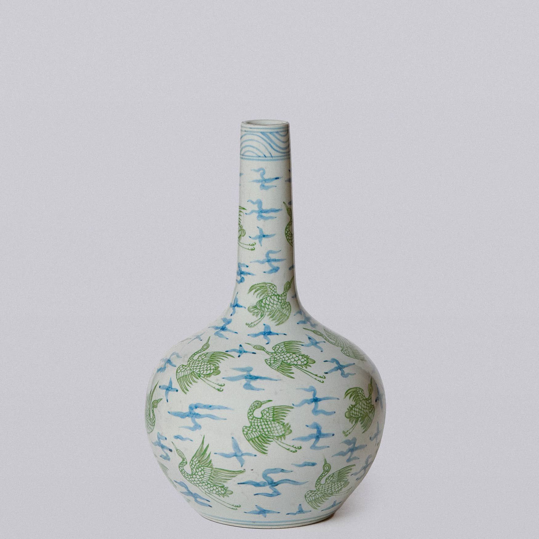 Green and Blue Porcelain Cranes and Clouds Globe Vase