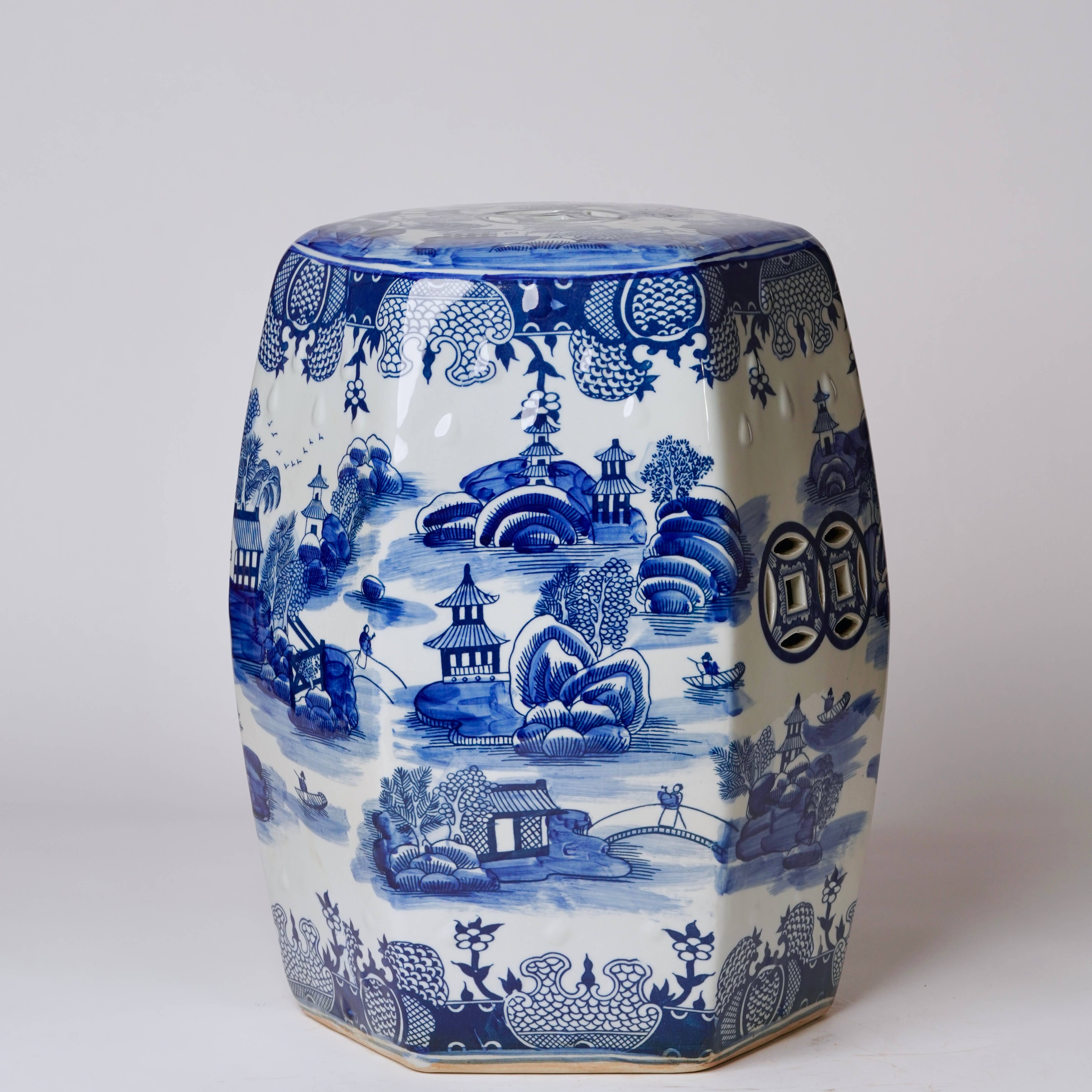 "Willow Ware" Blue and White Hexagonal Porcelain Garden Seat